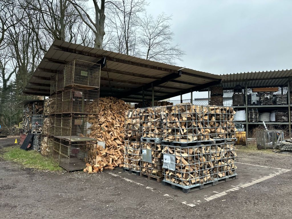 Aber wie geht es weiter, wenn die Stämme bei ihm abgeladen wurden? Das Holz muss erst einmal ein Jahr lang im ganzen Stamm trocknen, bevor es weiterverarbeitet werden kann. Johannes Kleine-Vossbeck lagert es auf seinem eigenen Hof, mitten in Marl, wo er genügend Platz dafür hat. Er erklärt: “Das Trocknen ist sehr wichtig, um die Feuchtigkeit im Holz zu reduzieren. Je trockener das Holz ist, desto besser brennt es und desto weniger Rauch und Ruß entsteht. Es sollte maximal eine Feuchte von 20% haben.“