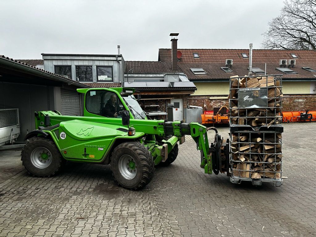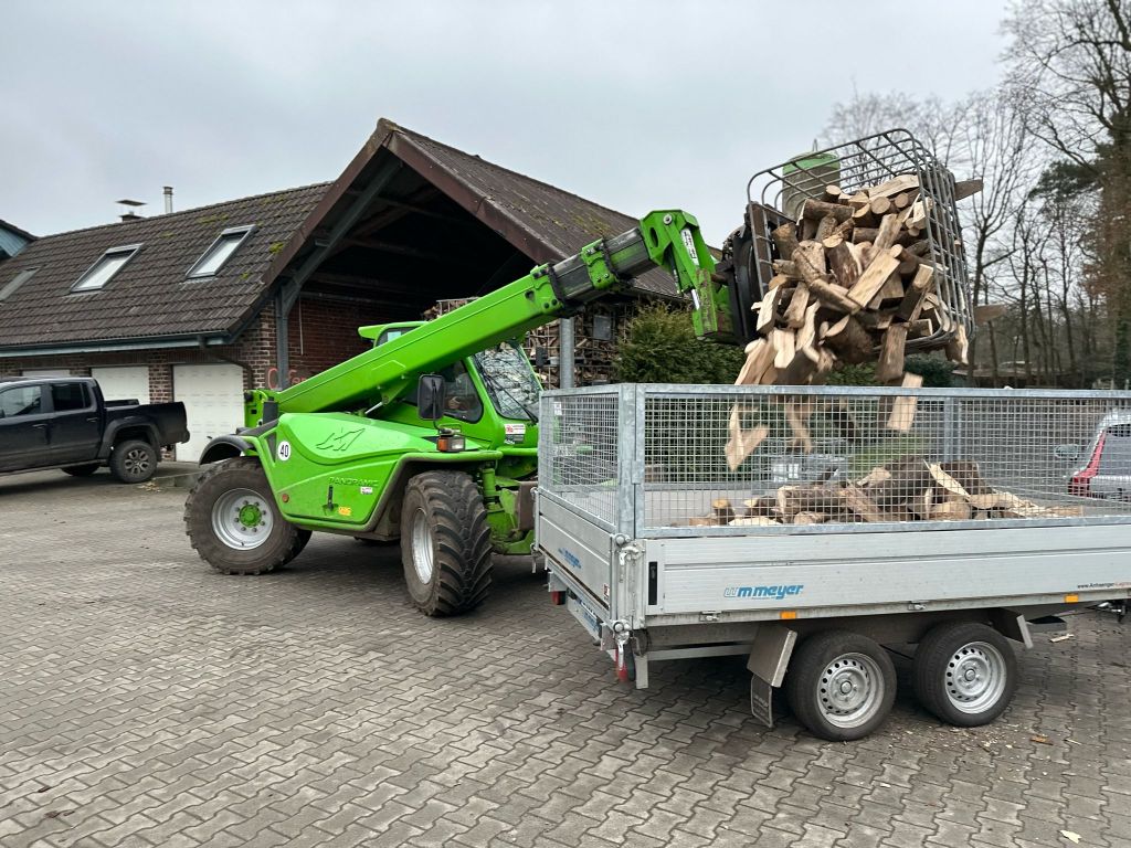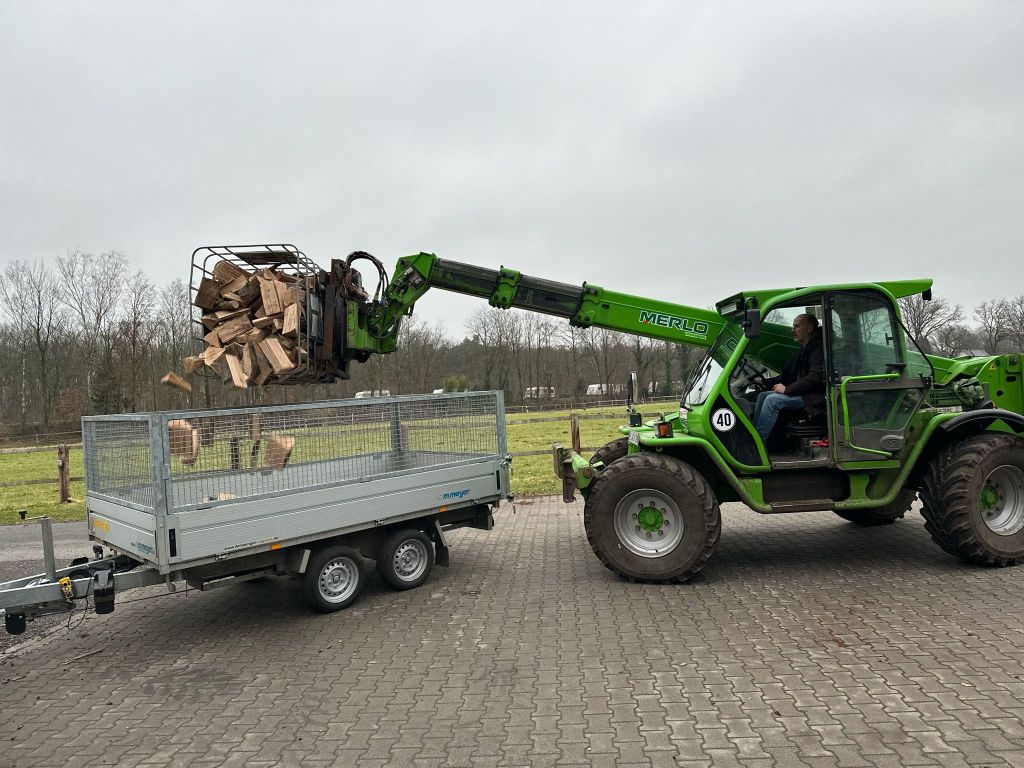 Nachdem der Stamm ein Jahr lang getrocknet wurde, kommt der spannendste Teil: das Spalten und Verladen. Johannes Kleine-Vossbeck hat einen eigenen Sägespaltautomat, mit dem er das Holz auf die richtige Größe bringt. Der Automat hört auf den Namen: „HAKKI PILKE“ . Johannes Kleine-Vossbeck lächelt und sagt: “Das ist mein Lieblingsgerät. Es macht mir Spaß, das Holz zu spalten und zu sehen, wie es in die Körbe fällt.” Die Körbe haben ein Volumen von 1,2 Schüttmetern, was etwa einem Raummeter entspricht. Das ist die gängige Maßeinheit für Brennholz.