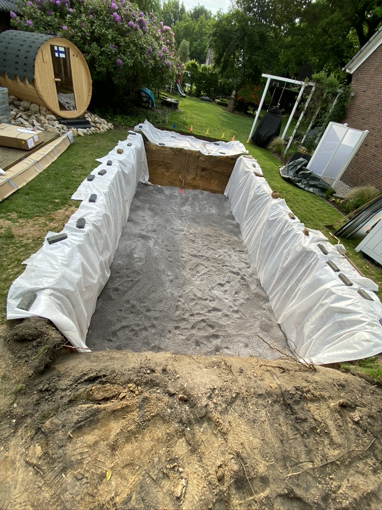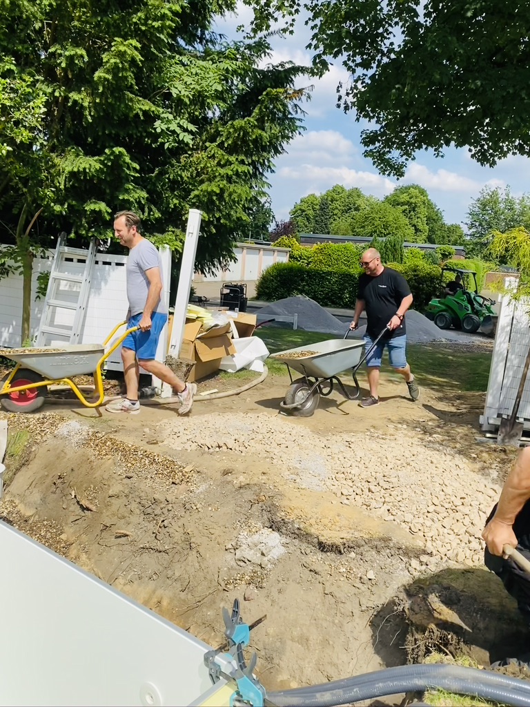 Ein Paradies. Im Hintergrund sehr Ihr in den einzelnen Boxen, die riesige Auswahl an Sand, Kies, Erde, Steinen und Co des Raiffaisen-Marktes in Marl-Polsum. Alles sofort vorrätig und einfach mit dem eigenen Anhänger abzuholen oder günstig liefern lassen. Einfach fantastisch.Auch große Bruchsteine sind hier sofort verfügbar Geheim-Tipp. Anstatt die teureren, einzelnen Säcke Rindenmulch im klassischen Baumarkt zu kaufen, könnt Ihr hier total günstig mit einem Anhänger vorfahren und Euch schnell und unkompliziert versorgen.Auch außergewöhnlicher Sand, wie der Dolomitsand, gehört zum Standart des Raiffeisen-Marktes in Marl-Polsum.Der „Klassiker“. Rheinsand. Hier 0-2mm. Ihr erhaltet jedoch auch andere Körnungen ohne Probleme direktvor Ort.Über 59 verschiedene Steinsorten sind im Markt in Marl-Polsum erhältlichHier bekommt man schon am Eingang ein gutes Gefühl. Wir leben Nähe. Das kann ich zu 100 % aus eigenen Erfahrungen bestätigen.Es kann losgehen. Die ersten Säcke Split 2-5 mm (3 Tonnen) werden per LKW angeliefert. Der gut gelaunte Lieferant Michael hat sichtlich Spaß, mit dem umhängenden Joystick, den Kran zu bewegen. Macht irgendwie noch in jedem Alter noch Spaß 🙂Da stehen sie nun auf meinem Rasen. In jedem Big-Pack 1 Tonne Split. Diesen benötige ich, um für den ConZero Pool den Untergrund sicher aufzubauen.Hier sehr ihr, wie nun der Split in meinem Loch verteilt wird.Unter dem Split liegt noch Schotter, da mein Boden leider mit Lehm zu weich war. Den Schotter gibt es auch im Raiffeisen-Markt zu kaufen.Nach 2 Stunden -und viel zu vielen Schubkarren- ist alles ordentlich verteilt. Jetzt kann es bald losgehen.Ein echter Sattelschlepper steht nun bei mir vor der Tür. Die Nachbarn schauen schon, was da los ist. Bis jetzt sieht er noch ganz sympathisch aus.Es kann (leider) losgehen. Gleich seht Ihr, wieviel 26 Tonnen (!!!) Kies 8-16mm tatsächlich sind. Jetzt gibt es kein zurück mehr. Die Ladeklappe öffnet sich und alles, was im LKW ist, liegt gleich bei mir auf der Straße. Und muss irgendwie meinen Garten…. 😦Irgendwie habe ich mir das anders vorgestellt. Und zwar nicht soviel Kies. Das wird ja immer mehr…So sehen also 26 Tonnen Kies aus, wenn sie ausgeladen sind. Puh….Ganz schön viel….Und hier wird nun der Kies als Stabilität für den Pool eingebracht.Und nun seht Ihr, wie der Kies von der Straße, in die Zwischenräume hinter meinen Pool kommt. Nach alter, traditioneller Art und Weise. Zu Fuß. Und mit der Schubkarre.Und so sieht dann das fertige Ergebnis aus. Ich denke, dass sich die ganze Arbeit gelohnt hat.
