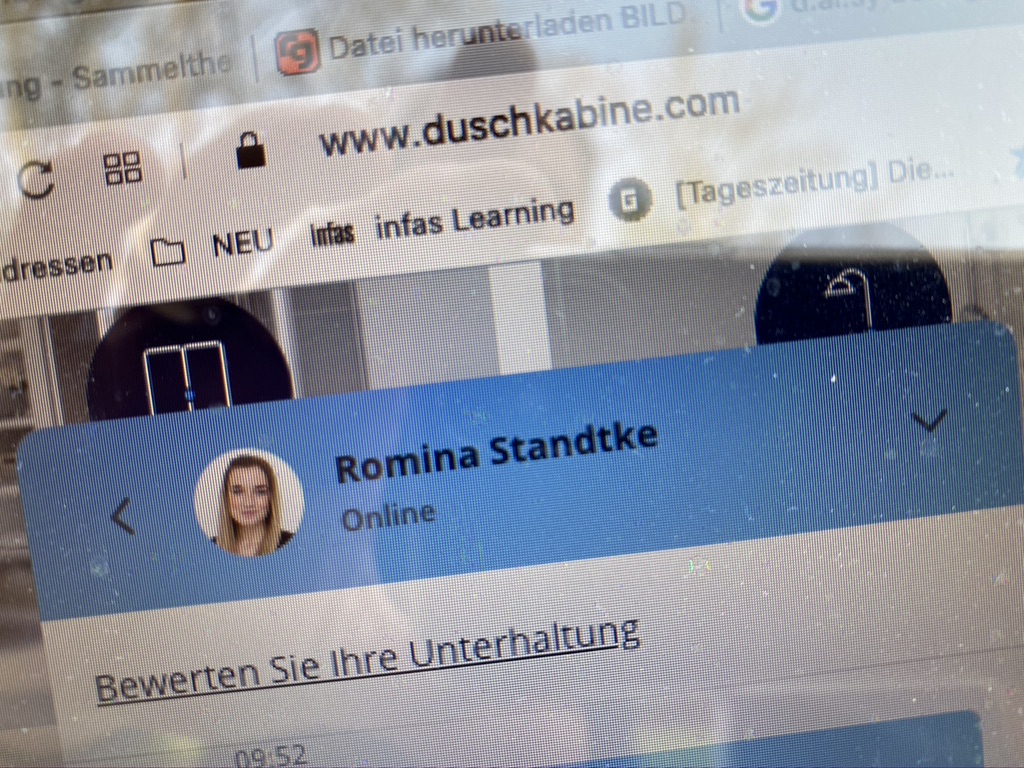 Was mir auch echt super gefallen hat, neben der Bodendusche: ich kann entweder per Telefon oder per Chat Kontakt zur Firma Duschkabine.com aufnehmen. Ich persönlich bin echt überrascht, dass ich nach schon 10 Sekunden sofort eine Mitarbeiterin (Romina Standtke) vom Team Breuer im Chat erreiche und ihr meine Fragen stellen kann (und das in Corona-Zeiten!). Ihr kennt das ja sicherlich auch, dass man keine Lust auf ewiges Warten in der Hotline hat. Aber auch, als ich einen Tag später per Telefon meine Bestellung aufgegeben habe, kam ich sofort durch und konnte mit einem Mitarbeiter sprechen. Dazu waren beide Kontakte mit duschkabine.com echt super freundlich und kompetent.