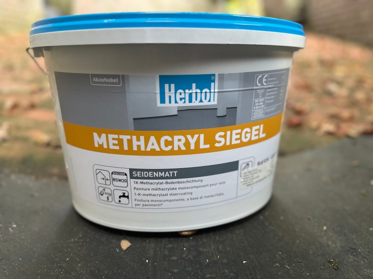 Das Methacryl-Siegel ist meine farbige Schicht. Es ist für innen und außen geeignet und macht auf Beton, Estrich oder Faserzement eine robuste, abriebfeste Oberfläche. In der Praxis heißt das: