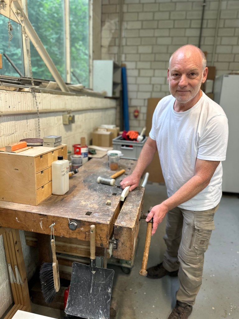 Wer Jörg in seiner Werkstatt in Dortmund besucht, versteht sofort, warum seine Arbeiten diese besondere Qualität haben. Es ist kein lauter, hektischer Ort, sondern ein Raum, in dem Konzentration spürbar ist. Der Duft von Holz liegt in der Luft, verschiedene Holzsorten lagern sorgfältig ausgewählt und sortiert – jede mit eigener Maserung, eigener Farbe, eigenem Charakter.